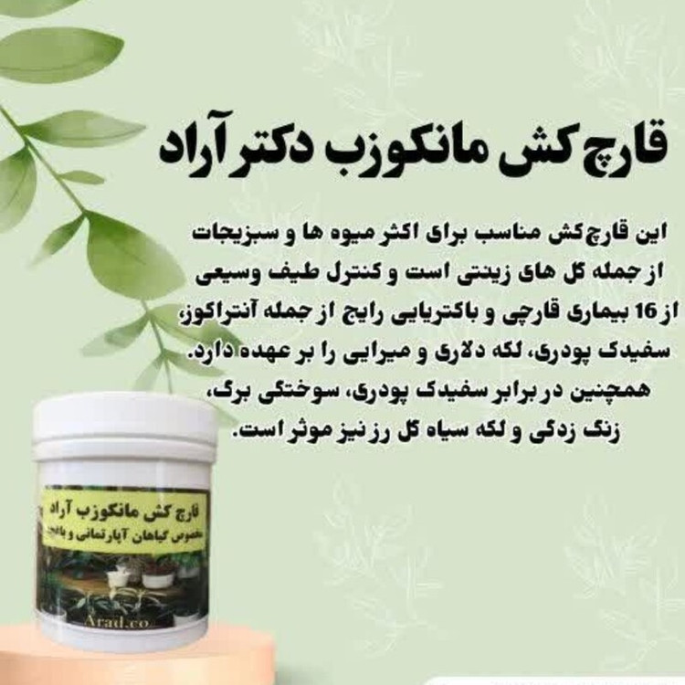 مانکوزب یک قارچ کش حرفه ای است که محافظت در برابر بیماری های برگ در تعداد زیادی از گونه های گیاهی را فراهم میکند. همچنین به عنوان قاتل اسپور عمل میکند. اسپورها گوگردی را جمع میکنند که با فرایندهای مهم در هاگ قارچ تداخل می کند. این قارچ کش مناسب برای اکثر میوه ها و سبزیجات از جمله گل های زینتی است و کنترل طیف وسیعی از 16 بیماری قارچی و باکتریایی رایج از جمله انتراکوز، سفیدک پودری، لکه دلاری و میرایی را برعهده دارد. همچنین در برابر سفیدک پودری ،سوختگی برگ، زنگ زدگی و لکه سیاه گل رز نیز موثر است. این قارچ کش مناسب اکثر میوه ها و سبزیجات از جمله گل های زینتی است. نحوه مصرف یک ق چ خ از پودر در یک لیتر آب حل کرده و به شاخ و برگ و خاک اسپری کنید . برای بیماری های خاکزی و ریشه گیاه با این محلول گیاه را آبیاری کنید و در دو نوبت با فاصله یک هفته تکرار نمایید.